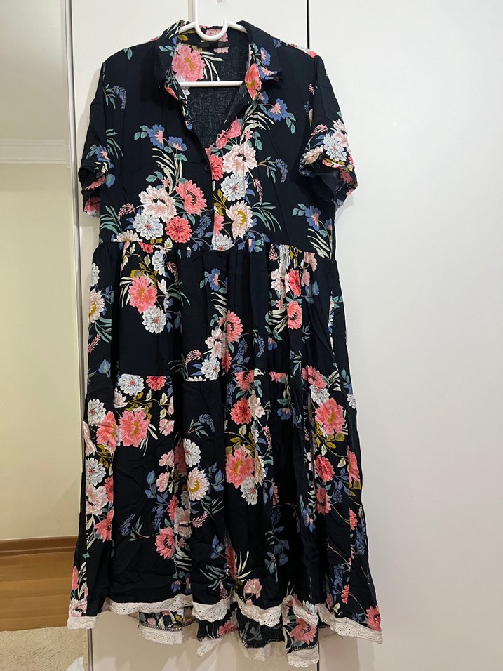 Kısa kollu, volan detaylı bohem uzun elbise. Koyu renk çok renkli çiçek desenli, V yakalı ve yumuşak tekstil kumaştan.