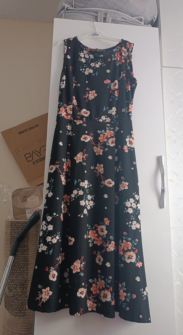 Kolsuz, straplez uzun elbise, çiçek desenli ve bol kesimdir. Sentetik kumaştan yapılmış, drapeli tasarıma sahiptir, bohem tarzı için uygundur.