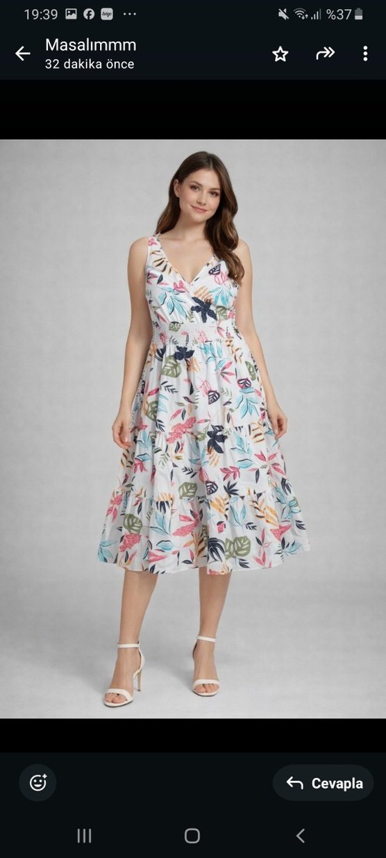 V yaka, kolsuz, pileli detaylı, bol kesim, çok renkli çiçek desenli hafif kumaştan uzun elbise.