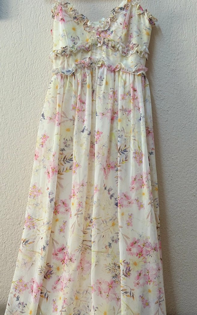 Bohem tarzda, ip askılı fırfır detaylı uzun elbise.Bir defa giyildi.