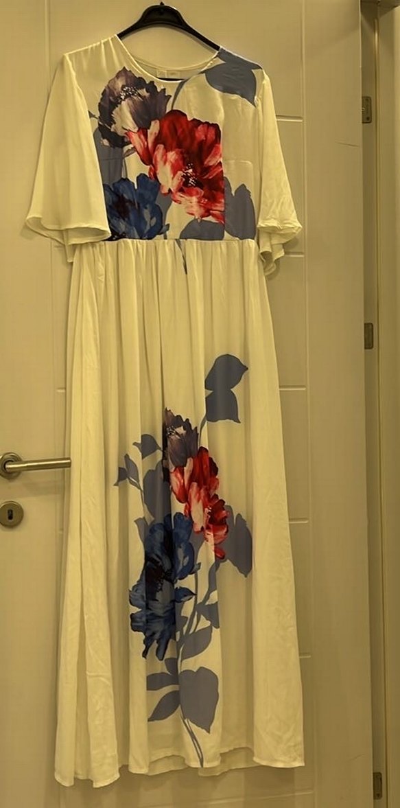 Askılı uzun elbise, bol kesim, drapeli kısa kollu, çok renkli çiçek desenli ve yumuşak düğün için uygun.