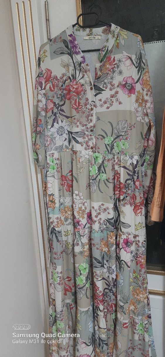 Bohem tarzda, bol kesim ve drapeli uzun elbise. Kayık yaka ve askılı kollu, çok renkli çiçek desenli yumuşak sentetik kumaştan yapılmıştır.