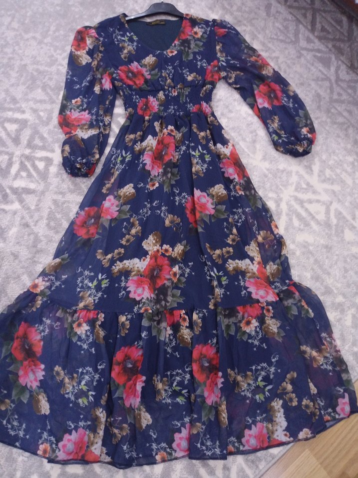 Çiçek desenli, uzun ve bol kesim elbise, fırfırlı detaylar ve uzun kolludur. V yaka ve bohem tarzındadır, günlük kullanıma uygundur.
