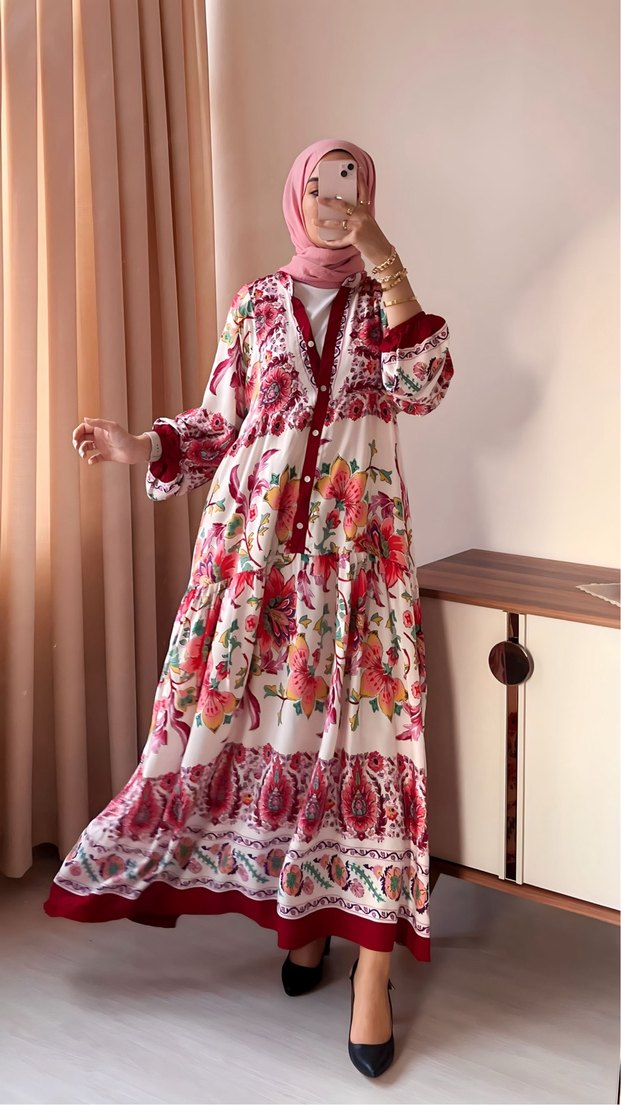 Yüksek yakalı, uzun kollu ve bol kesimli bu uzun elbise, canlı çiçek desenleriyle süslüdür. Yumuşak sentetik kumaştan üretilmiş, drapeli detaylara sahiptir.