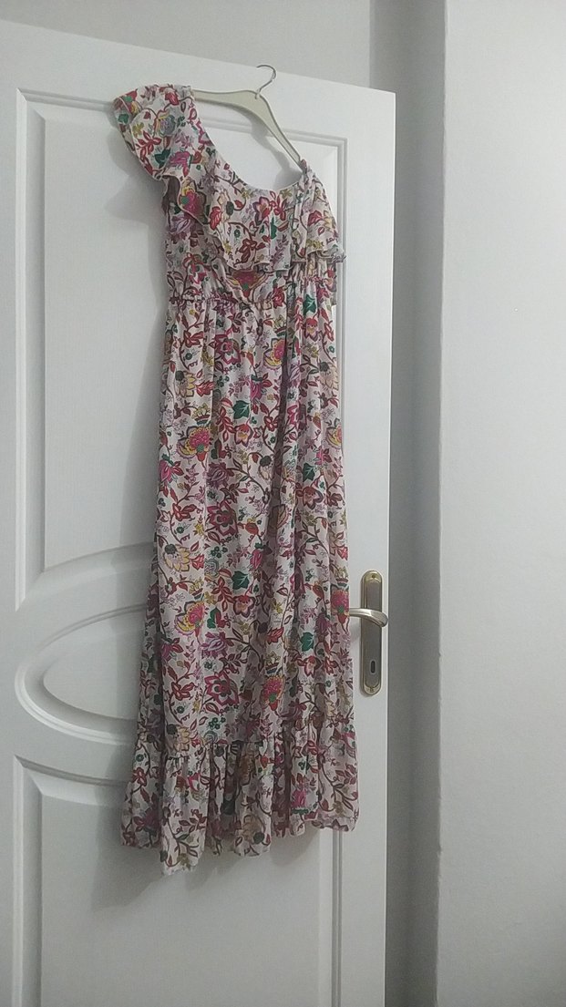 tek kol Askılı tek kol bağlamalı , bol kesim ve çiçek desenli bu bohem uzun elbise, fırfır detaylarıyla günlük kullanıma uygundur.