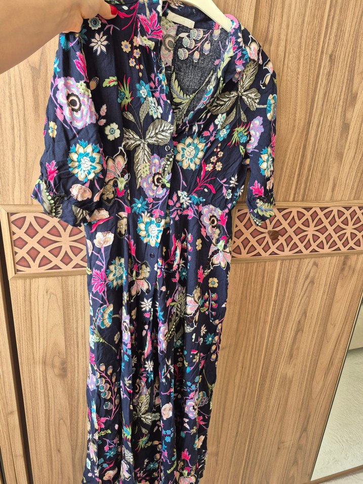 Bohem tarzda, bol kesim, çiçek desenli, V yaka ve düğmeli uzun elbise. Kısa kollu, koyu çok renkli sentetik kumaştan, günlük kullanıma uygun.