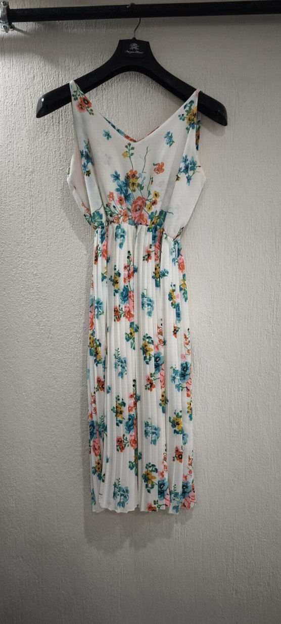 Bohem tarzda, V yaka ve pileli uzun elbise. İnce askılı, bol kesim ve hafif çiçek desenli sentetik kumaştan yapılmıştır.