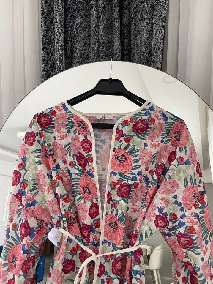Kadınlar için uzun, bol kesim ve uzun kollu elbise. Yumuşak sentetik kumaştan, V yaka, pastel çok renkli çiçek desenli, düğmeli ve bel bağcıklı. Günlük kullanım için bohem tarzda.