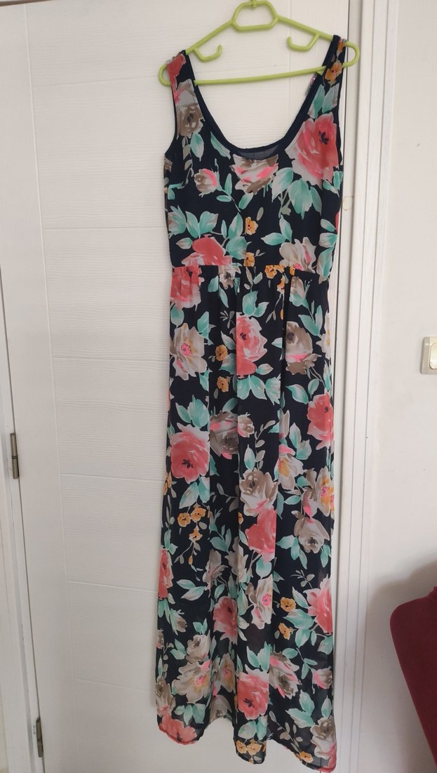 Karanlık çok renkli çiçek desenli, V yaka, drapeli ve bol kesim bohem uzun elbise, günlük kullanım için.