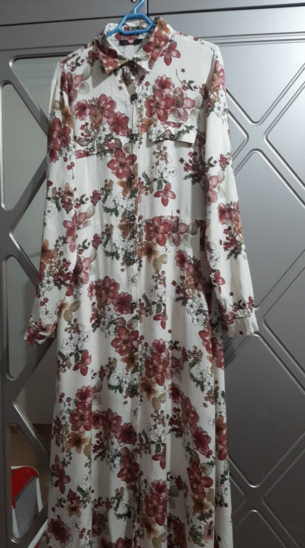 Çiçek desenli, uzun kollu, bol kesim ve düğmeli önü olan, bohem tarzında çok renkli uzun elbise.