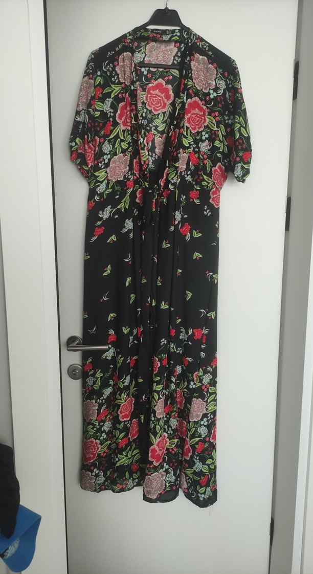 Bohem tarzda, drapeli, bol kesim uzun elbise. V yaka ve ince askılı, koyu renkli çok renkli çiçek desenli.