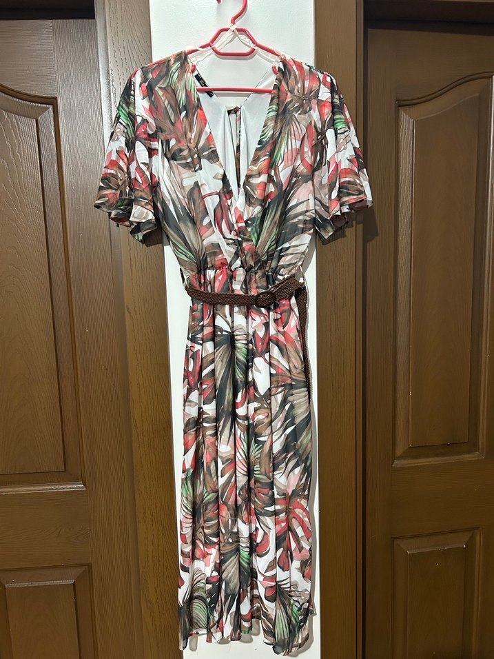 Bohem tarzda, bol kesim ve drapeli uzun elbise. Kısa kollu, V yakalı ve çok renkli baskılı yumuşak sentetik kumaştan. İçi beyaz astarlı . Hiç giyilmedi.