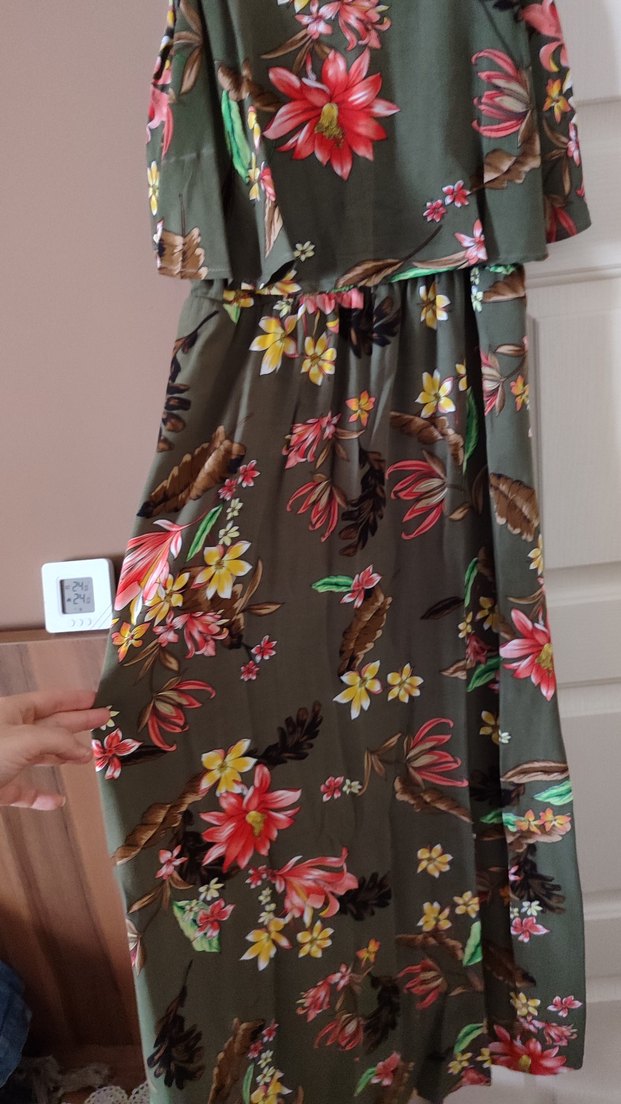 Çiçek desenli ve bol kesim uzun elbise. Yumuşak sentetik kumaştan, bohem tarzı için uygun, fırfır detaylı.