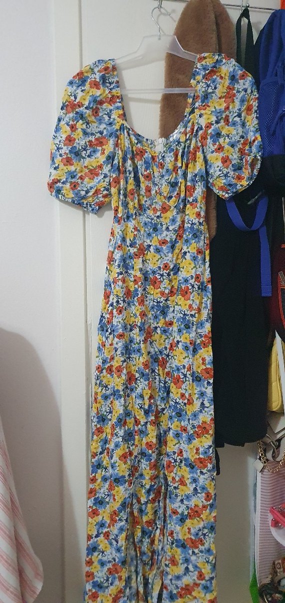 Bohem tarzda, straplez kısa kollu, bol kesim uzun elbise. Sentetik kumaştan, açık renklerde canlı tie-dye çiçek desenli, günlük kullanıma uygun.