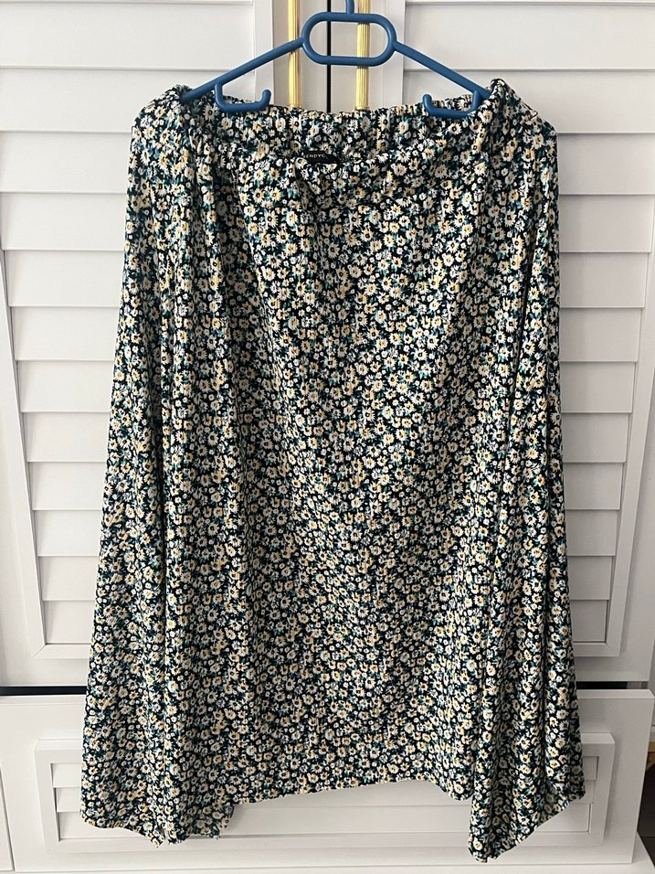 Bohem tarzda, bol kesim ve drapeli uzun etek. Koyu renkli çok renkli çiçek desenli, yumuşak sentetik kumaştan günlük kullanım için uygun.