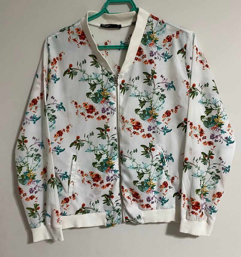 Çiçek desenli, beyaz, uzun kollu, V yakalı, düğmeli hafif kumaştan rahat kesim ceket. Günlük sokak giyimi için uygun.