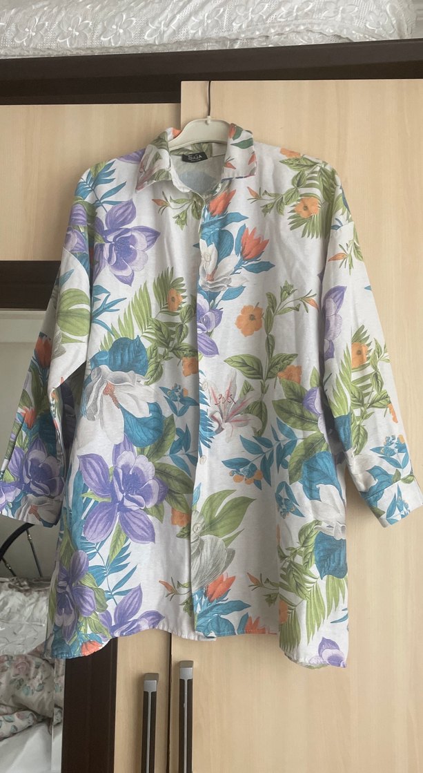 Bu bol kesim kadın gömleği, uzun kollu ve düğmeli ön yapıya sahip olup pastel çiçek desenleriyle bohem tarzını yansıtıyor. Tekstil kumaştan yapılmış, günlük kullanım için rahat bir seçenek sunar. Pareo olarak kullanılabilir L beden