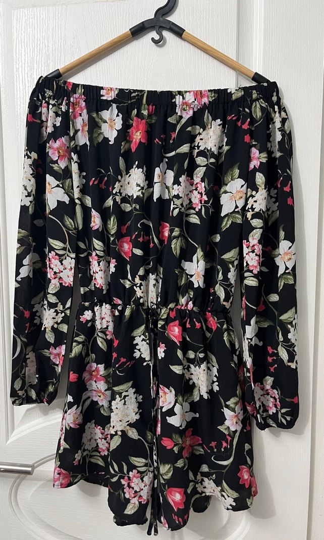 Bu bohem tulum, koyu zemin üzerine çiçek desenli, uzun kollu ve straplez yakalıdır. Düğme detaylı ve bol kesimdir, günlük kullanıma uygundur .