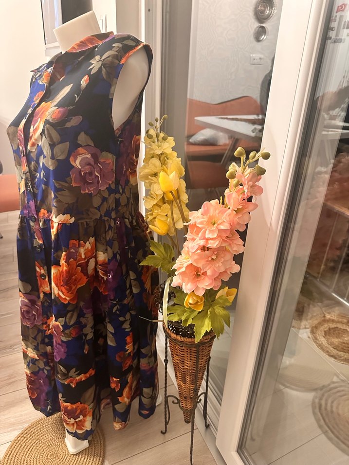 Bohem tarzda, koyu renkli çok renkli çiçek desenli uzun, kolsuz, bol kesim elbise. Dökümlü tasarım ve V yaka, yumuşak kumaştan, günlük kullanım için uygun.