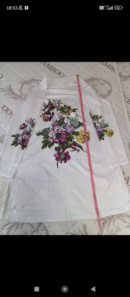Çiçek desenli, V yakalı, uzun kollu ve bol kesim hamile tunik, günlük kullanıma uygun.