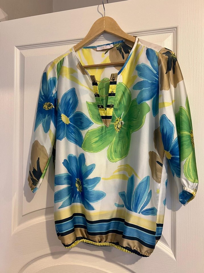 V yaka ve düğmeli ön detaylı, bol kesim, çiçek desenli uzun kollu bluz. Yumuşak sentetik kumaştan, günlük kullanıma uygun.