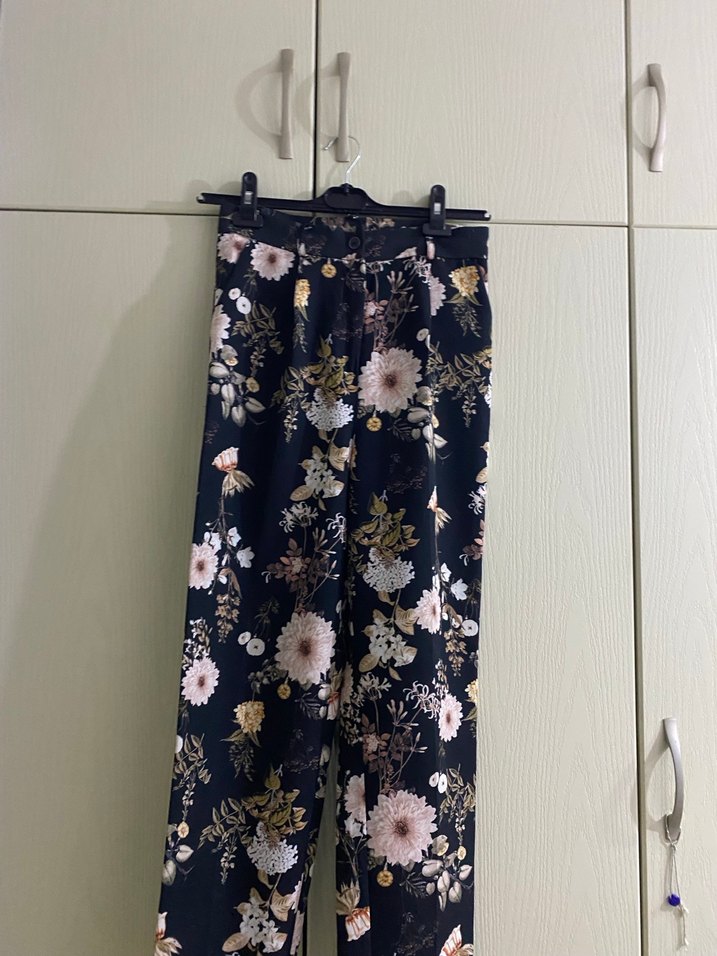 Sentetik kumaştan, bol kesim ve pileli, koyu renkli çiçek desenli midi kumaş pantolon. Günlük sokak tarzına uygundur.