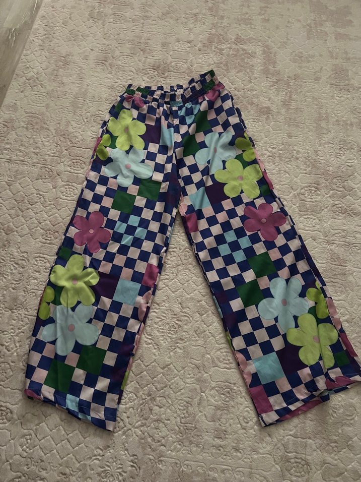 Pastel tonlarda çiçek ve kare desenli, düğmeli bol kesim midi kumaş pantolon, rahat sokak stili için uygun.