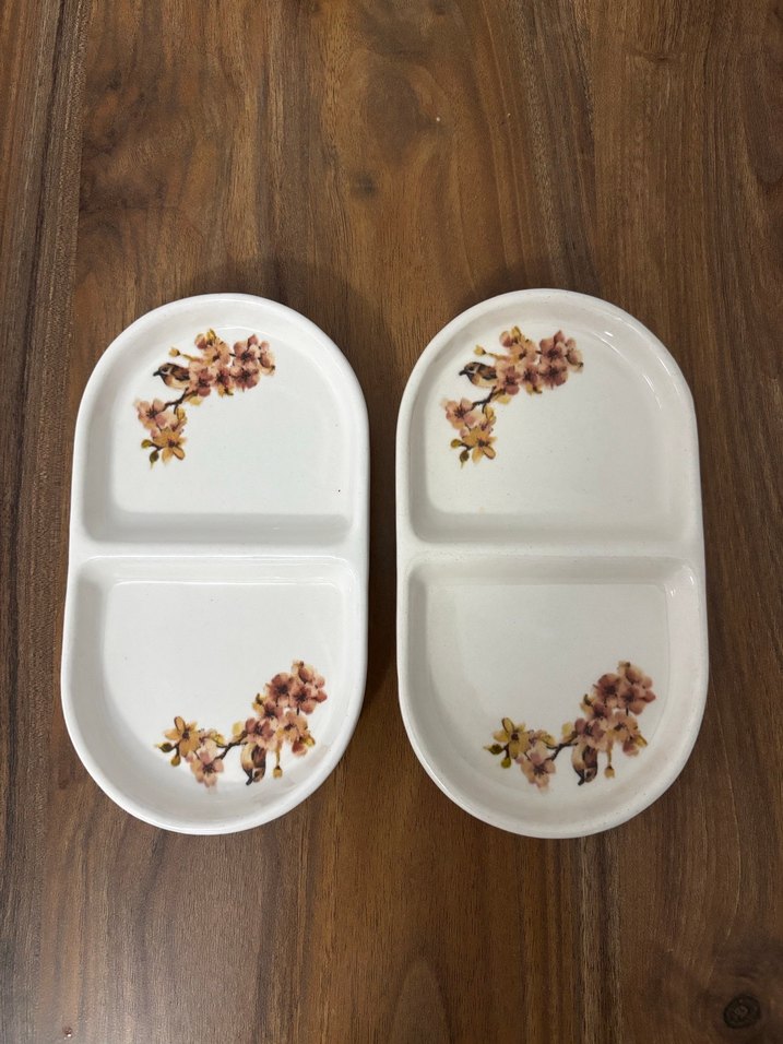 Çiçek desenli, bölmeli beyaz tabaklar yiyecekleri ayrı ayrı sunmak için uygundur. Hafif ve şık tasarım. ️