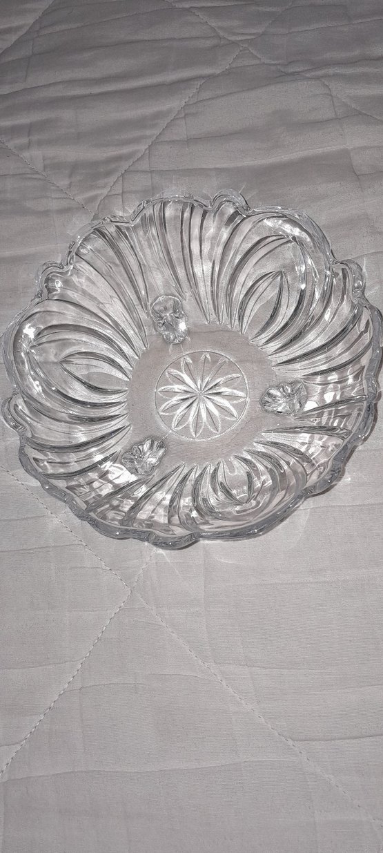 Şeffaf camdan yapılmış, çiçek desenli ve hafif detaylara sahip geleneksel tarzda tabak. ️
