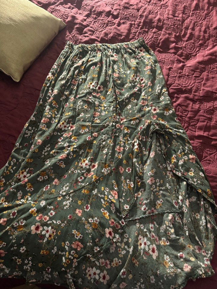 Sentetik kumaştan, çiçek desenli koyu renkli, bol kesim ve drapeli uzun etek. Günlük kullanıma uygun tarzda. L beden