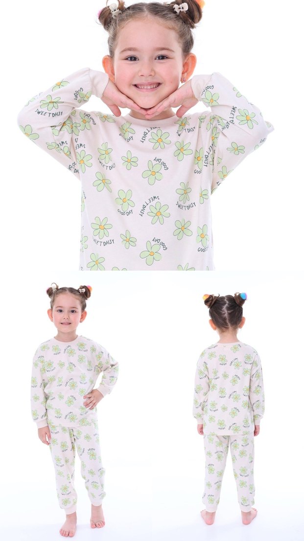 Çocuklar için pastel beyaz zemin üzerine çiçek desenli ve hafif batik desenli, yumuşak ve rahat kumaştan yapılmış pijama. %100 cotton pamuktur. 3-4/4-5/5-6/6-7/7-8 yaş mevcuttur