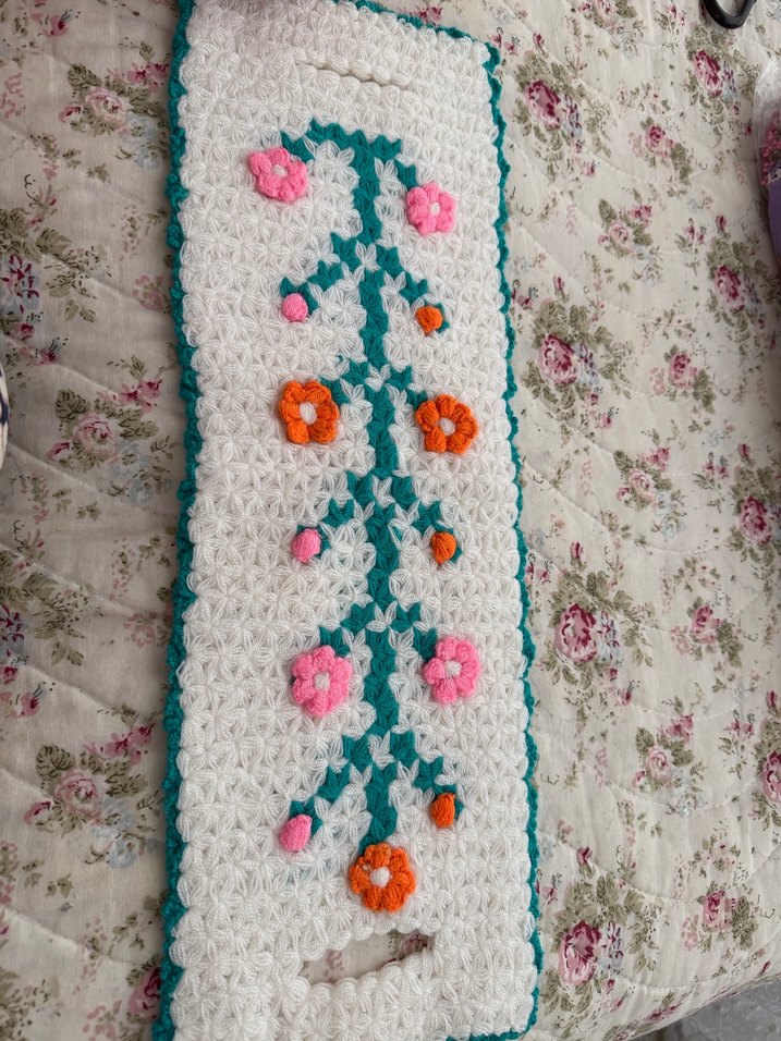 Çiçek desenli çok renkli banyo süngeri, beyaz zemin üzerine pembe, turuncu ve yeşil detaylarla. Yumuşak dokusuyla nazik temizlik sağlar.
