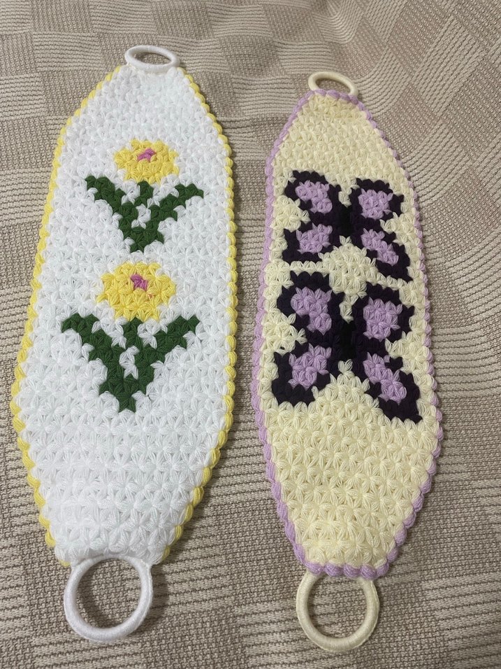 Çiçek desenli, çok renkli iki banyo süngeri, her biri kolay asma halkalarına sahip. Yumuşak dokulu, nazik temizlik için uygundur.