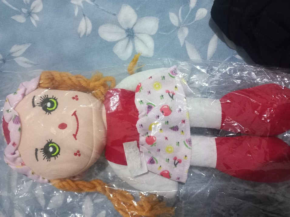 Çiçek desenli etekli, yumuşak kumaştan yapılmış çok renkli bez bebek, turuncu ip saçlı ve gülümseyen yüzlü.