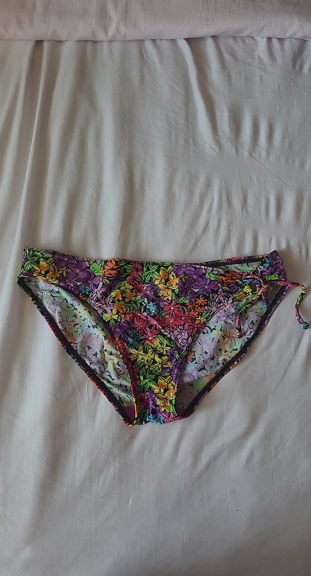 Kadın bikini altı, koyu canlı çok renkli çiçek desenli, elastik ve vücuda oturan kesimli, askılı detaylıdır, plaj için uygundur. SIFIR YURTDIŞI ÜRÜNÜ
