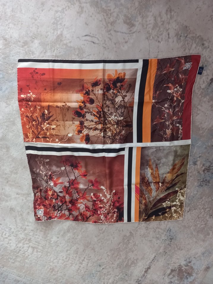 Kadınlar için çok renkli, koyu çiçek desenli, sentetik kumaştan drapeli bohem tarzda fular. iki üç kez kullanıldı. levidor marka twill ipek, tivil ipek.