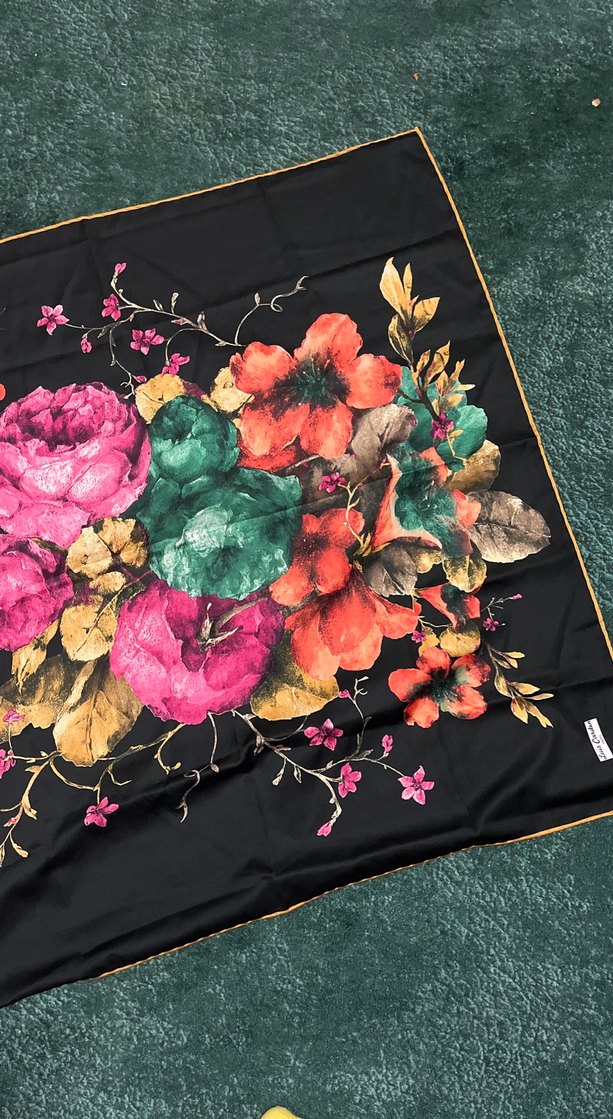 Kadınlar için koyu zemin üzerine canlı çok renkli çiçek desenleri içeren, yumuşak sentetik kumaştan yapılmış ve bohem tarzını yansıtan şık bir eşarp