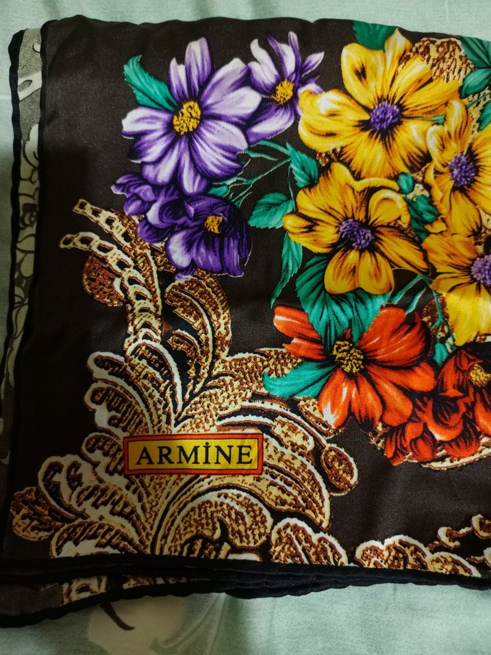 Drapeli, koyu renkli sentetik kumaş üzerine canlı çiçek desenli, vintage bohem tarzı kadın fular. ARMiNE markalı. tivil ipek tir rengi bu kadar canlı değil çok iyi durumdadır deformasyon yoktur