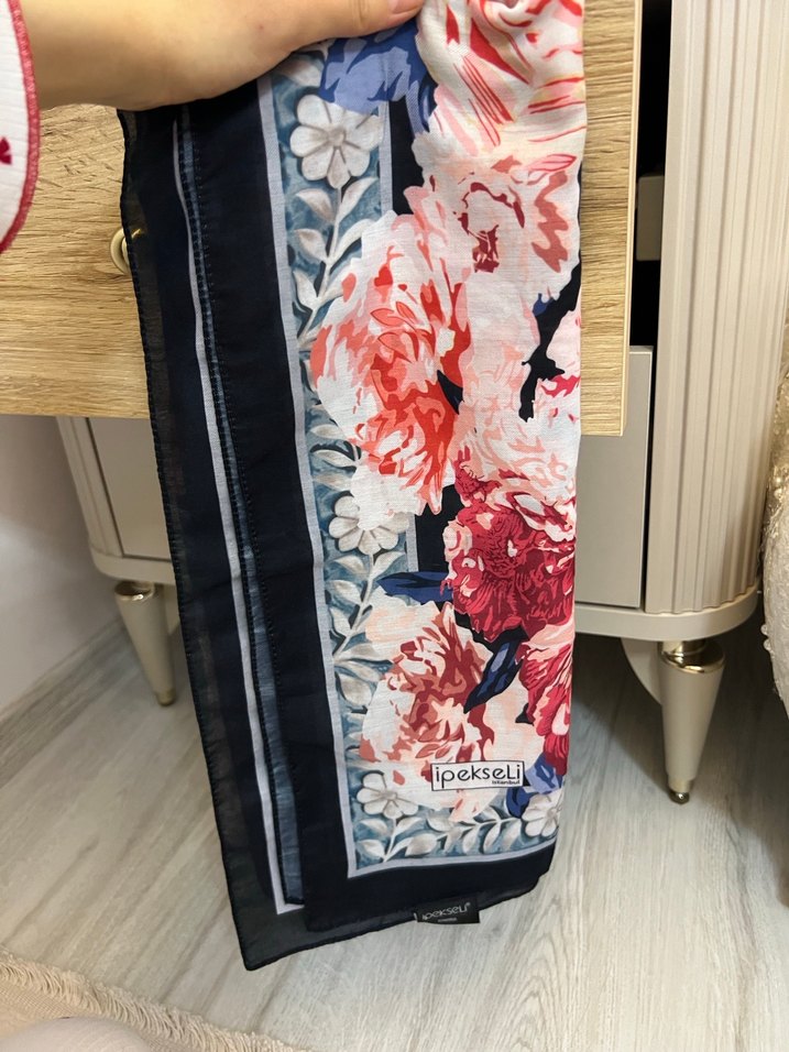 Kadınlar için çok renkli çiçek desenli, dökümlü bohem tarzda sentetik kumaştan yapılmış Paris esintili bir fular.