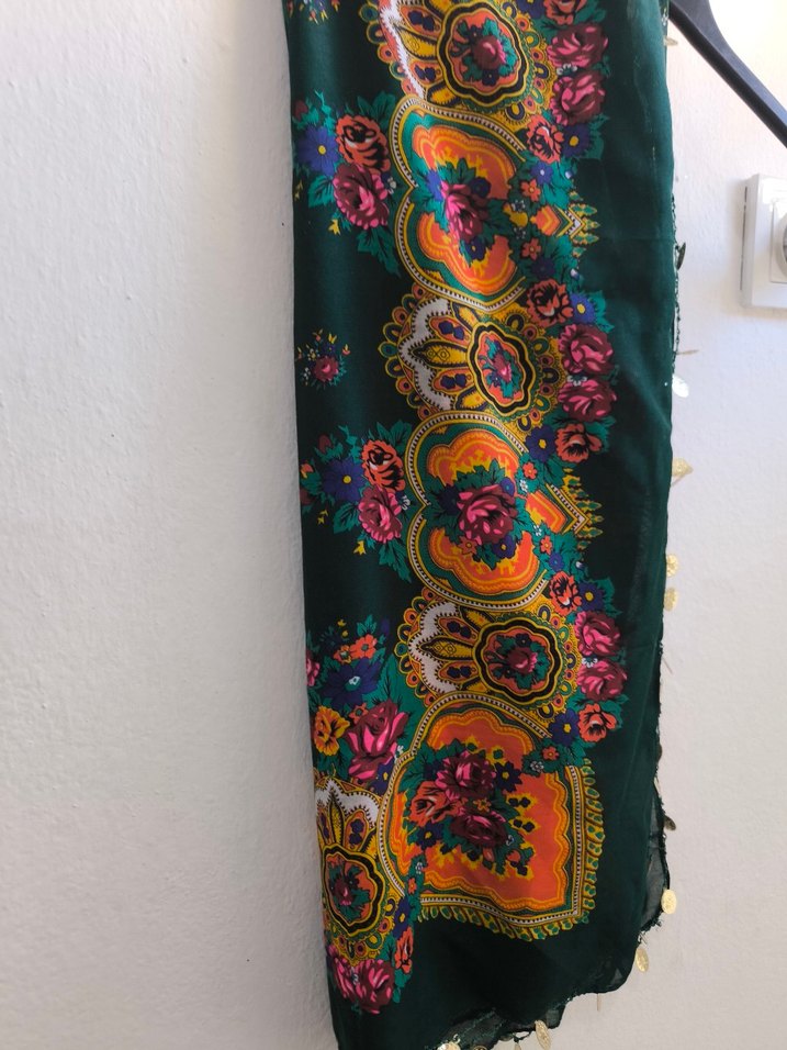 Çiçek ve paisley desenleriyle çok renkli, koyu tonlarda tekstil kumaştan bohem tarzda şal. Drapeli tasarım öne çıkar. Urfa da kafama taktırmıştım öyle de kullanabilirsiniz