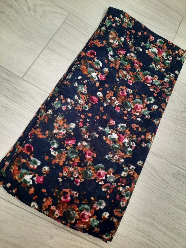 Çiçek desenli, çok renkli ve dökümlü bohem tarzda, yumuşak sentetik kumaştan yapılmış kadın şalı.