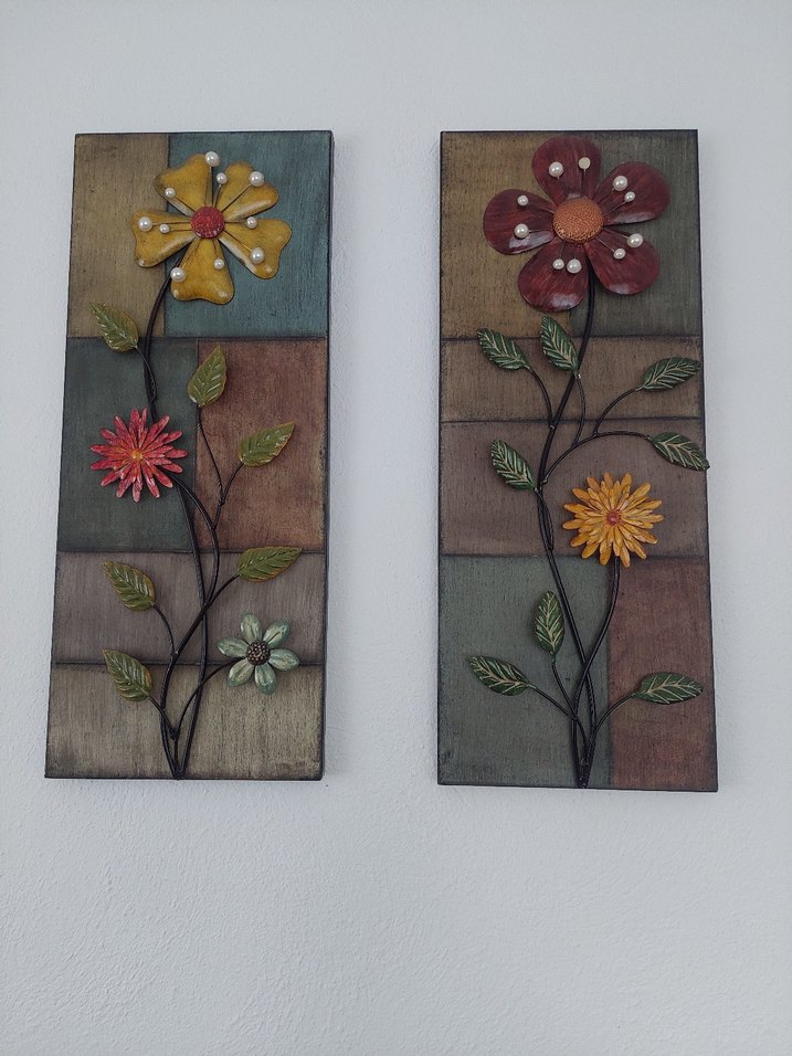 İki dikdörtgen duvar panosu, koyu tonlu arka planlarda renkli 3D çiçek tasarımları ve yeşil yapraklarla sanatsal bir hava katıyor. Ürün ferforjedir. Boy 77 cm , en 30 cmdir . Herhangi bir yerinde hasarı yoktur.