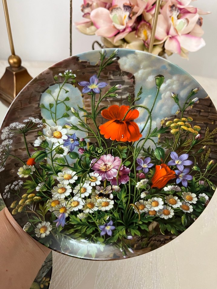 Duvar tabağı gökyüzü fonu üzerinde papatyalar ve gelincikler gibi detaylı çiçeklerle çok renkli koyu bir tasarıma sahiptir.