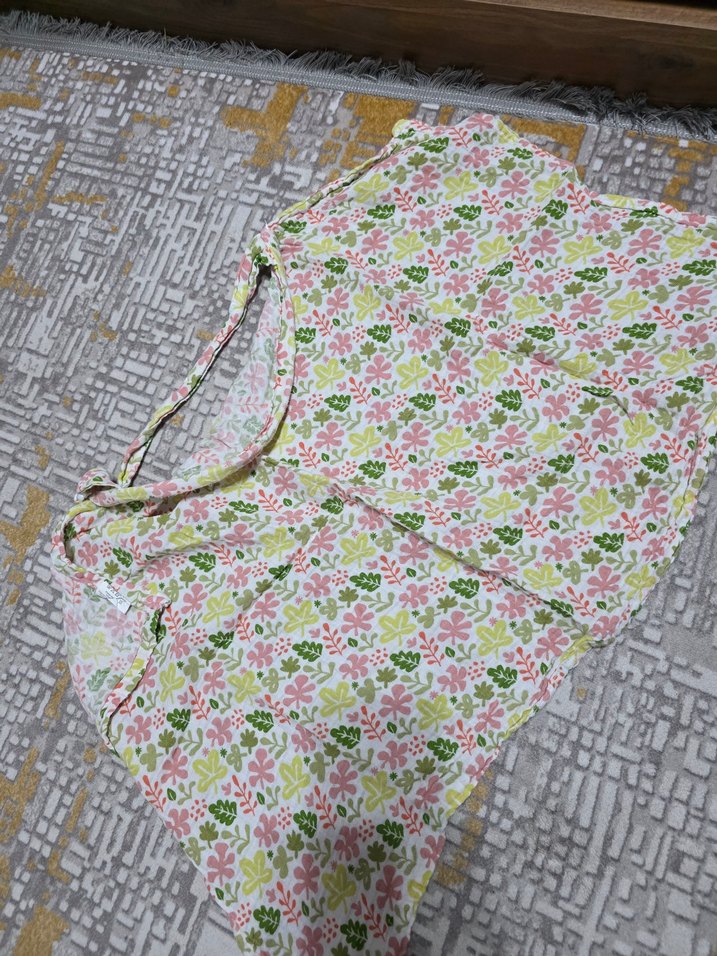 Çok renkli pastel tonlarda çiçek desenli, boyun ve bel bağlamalı emzirme önlüğü. Sorunsuzdur