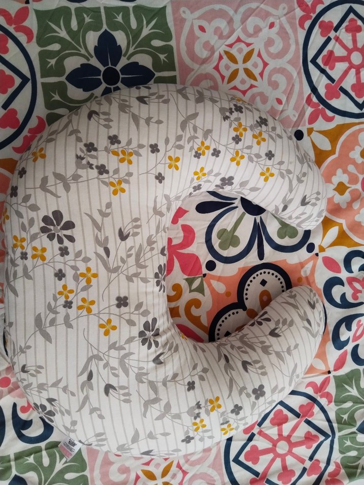 Gri tonlarda çiçek desenli, çok renkli emzirme ve hamilelik yastığı, konfor ve destek sağlar. çok az kullanıldı ebebegin ürünü