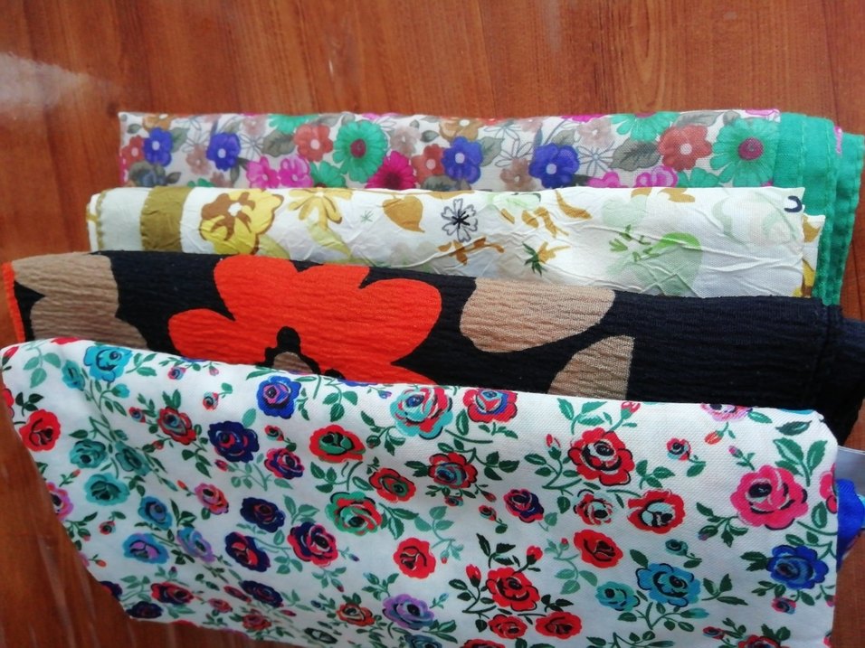 Çiçek desenli, koyu ve canlı renklerde çok desenli eşarp