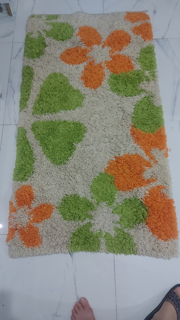 Yumuşak bej zemin üzerinde yeşil ve turuncu çiçek desenleriyle renkli, çağdaş tarzda bir halı. 80 ×150