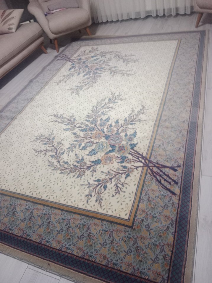 Çiçek desenli, açık tonlarda çok renkli klasik tarzda halı. Yumuşak dokulu ve ortama zarif bir dekoratif dokunuş katar.