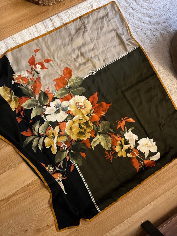 Kadınlar için çok renkli, koyu tonlarda çiçek desenli, yumuşak ve ipeksi dokuda, bohem tarzda drapeli eşarp.