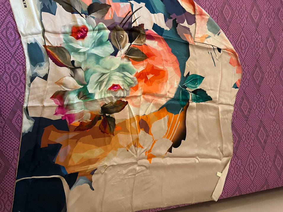 Kadınlar için çok renkli çiçek desenli, ipeksi ve drapeli eşarp, bohem tarzı için uygundur. İğne kusurları bulunuyor.